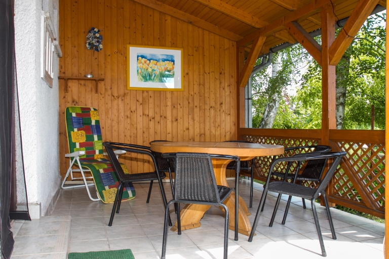 Földszint: Nappali, főzőfülke, étkező, zuhanyzó, WC, egy kétágyas szoba, terasz, fedett terasz